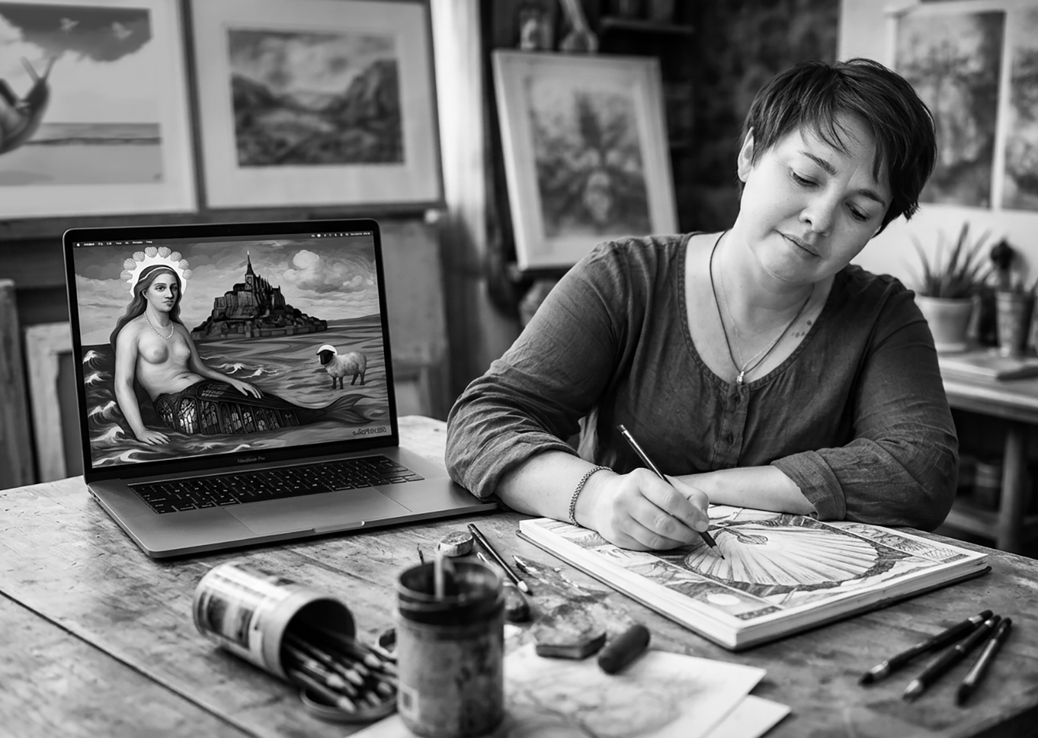 Chaque oeuvre trouve son origine dans le dessin. Le processus commence toujours sur papier, à travers des croquis et des recherches de composition qui me permettent de structurer l’image et d’en poser la narration. Ce premier travail de construction constitue l’architecture de l’oeuvre et guide ensuite le développement de la peinture dans l’espace numérique.