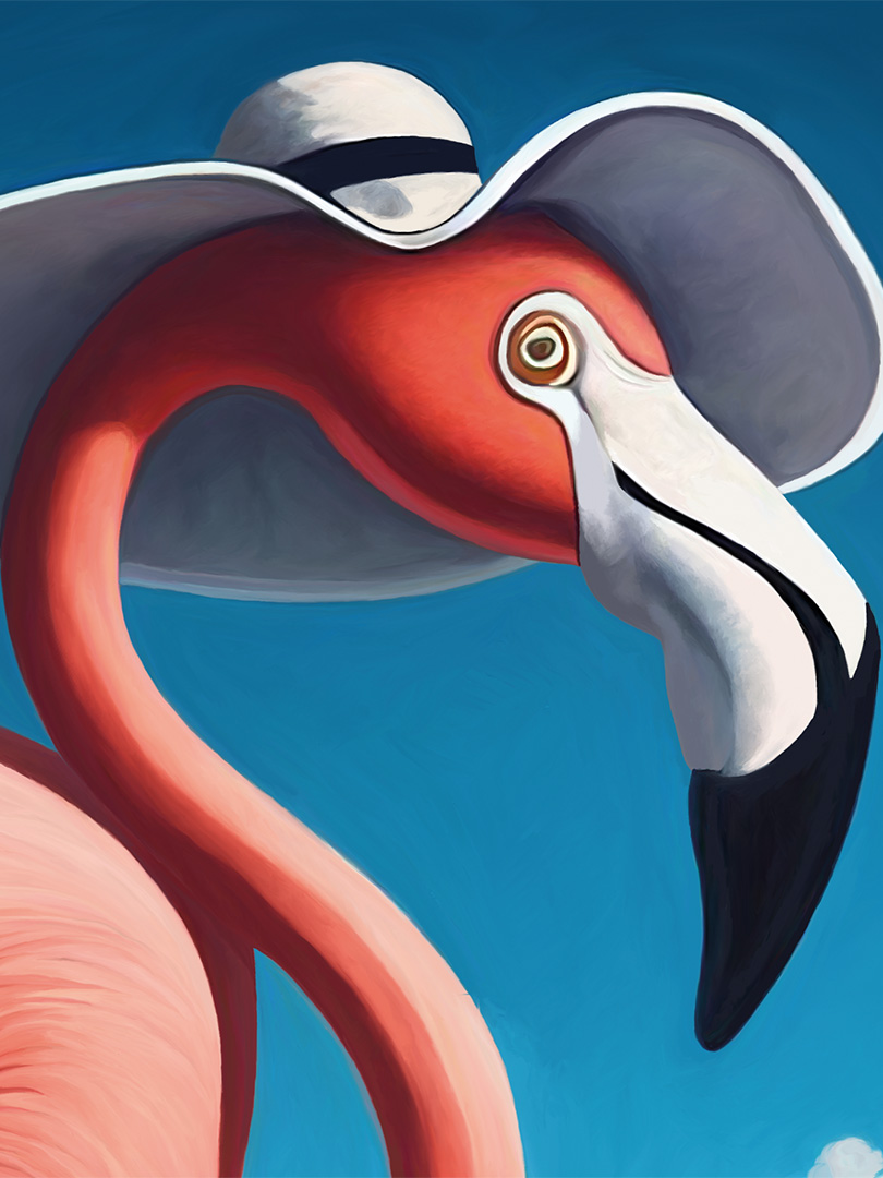 Rencontre onirique du flamant rose et de la dame au chapeau